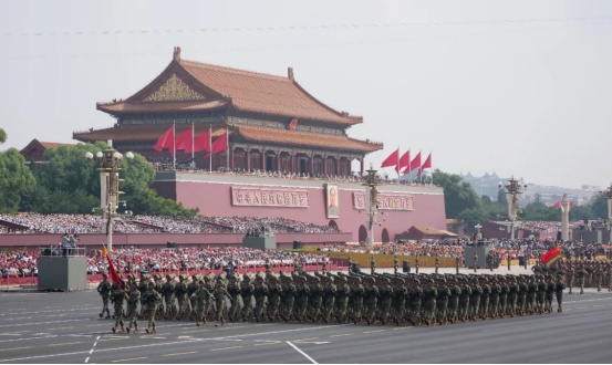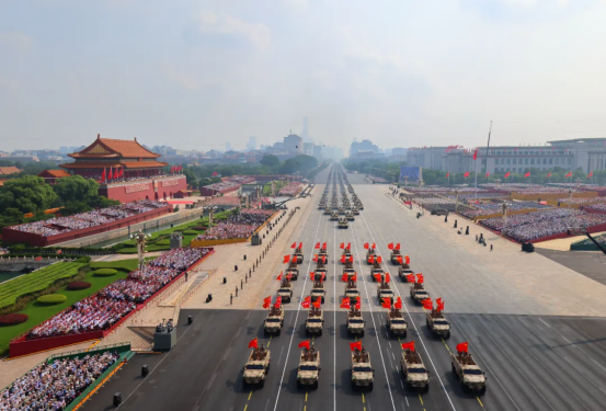 阅兵式上,徒步方队步伐整齐划一、铿锵有力;装备方队展示着国产现役主战装备;空中梯队呼啸而过,展现出国家强大的国防力量。无人智能装备、水下作战装备、网电攻防装备等新域新质力量亮相,体现了新时代强军风貌。