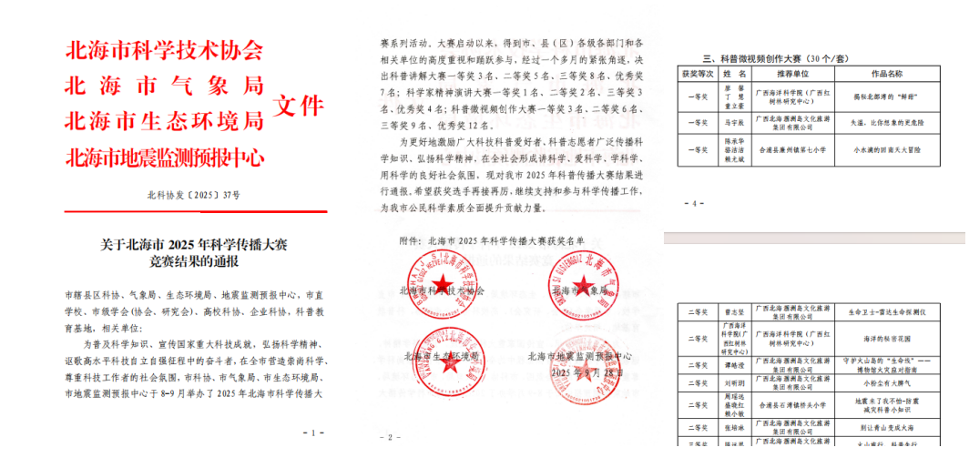 近日,北海市科学技术协会、北海市气象局、北海市生态环境局、北海市地震监测预报中心联合举办了 “2025 年北海市科学传播大赛”系列活动。广西海洋科学院参加了科普微视频创作大赛,可喜的是,参赛的两部作品从众多参赛作品中脱颖而出:其中“揭秘北部湾的‘鲜甜’”荣获一等奖、“海洋的秘密花园”荣获二等奖;这既是科普工作的硕果,也是科学传播方式的生动诠释。未来,科研人员将持续深耕科普创作,用更多优秀作品讲好海洋故事,激发公众探索科学的热情。