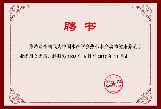 图1 李鹏飞研究员当选中国水产学会热带水产动物健康养殖专业委员会委员聘书